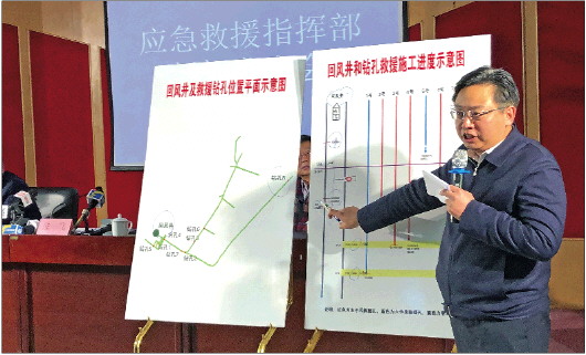 1月18日17时,栖霞笏山金矿爆炸事故应急指挥部召开第四场新闻发布会。应急指挥部副总指挥、烟台市委副书记、市长陈飞介绍救援最新进展,并通过示意图详细解读。