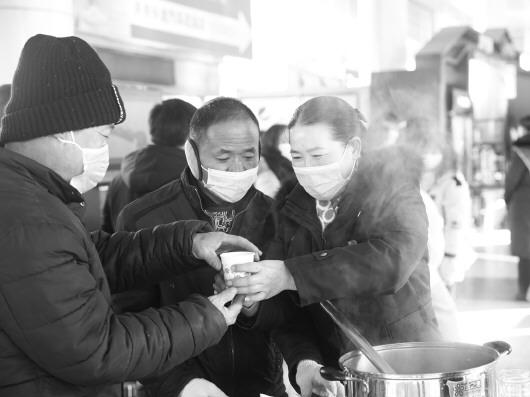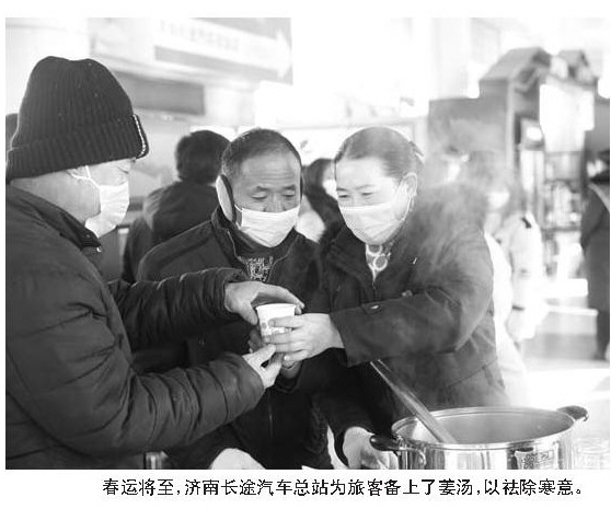 春运将至,济南长途汽车总站为旅客备上了姜汤,以祛除寒意。