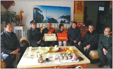 李京进一行分别来到在部队荣利二等功现役军人卢存元、三等功现役军人高群、王素奎家中进行走访慰问,将喜报送到每一位军属手上,还为每家送去了面粉、大米、食用油、慰问金以及新春的祝福。李京进一行详细了解他们家庭的生产生活情况,感谢他们为国家、为部队培养了优秀的军事人才。