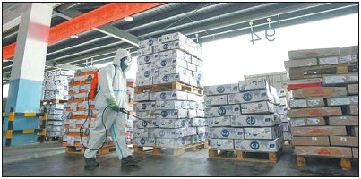 在武汉万吨·华中冷链港,工作人员对进口冷链食品卸货区进行消杀。 新华社发
