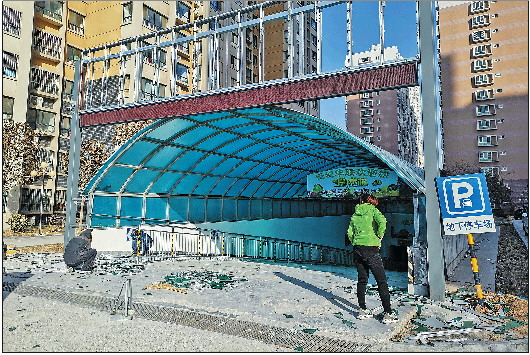 ◤地下车库入口处的超市灯光牌已被拆除,几名工人正在清理。