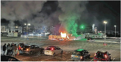 1月24日,在荷兰于尔克市,反防疫措施的示威者焚烧了当地一座新冠病毒检测站。