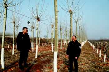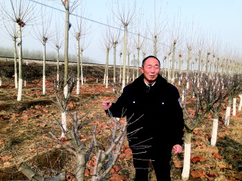 在朱峰的带领下,记者来到吴家湾村的苗木高档绿化苗木种植项目,南北约600米的土地上以两米为间隔栽植满了法桐和北美海棠,法桐已经长至约1.5公分的粗细,而海棠则刚刚长到成年人的腰部位置,凌冽的寒风下,去年春天栽下的树苗如今只能看到枝桠。村民吴建伦正在拿着剪子修剪树枝,前些年有过树木种植养护经验的他,如今又派上了大用场。和吴建伦一同在地里忙活的,还有村民吴建书。