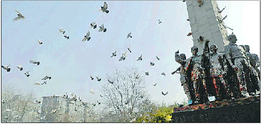3日上午,上千只和平鸽在潍县乐道院·西方侨民集中营博物馆上空凌空飞翔。