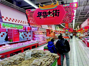(上接二版)往年的年货大街让市民体验一站式购齐的方便,现在各大超市内也早早地摆起了年货。走进大润发,看到一片红彤彤,喜洋洋年味儿就出来了,装饰品、酒类、糖果、干果等春节必备的商品琳琅满目,不少前来采购年货的市民将手推车装得满满当当。“今年孩子们有的在外地不回来了,我给他们邮寄点咱济宁的特产。”市民高女士和老公各推着满满的一车年货说,孩子们在外地工作,山珍海味的也都不稀罕,给他们带点微山咸鸭蛋、泗水粉条之类济宁特产,即使在外地,也能尝到家乡的味道。