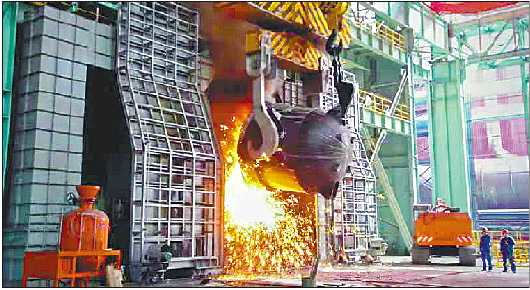 ▲炼钢厂的转炉正在注入铁水进行冶炼。