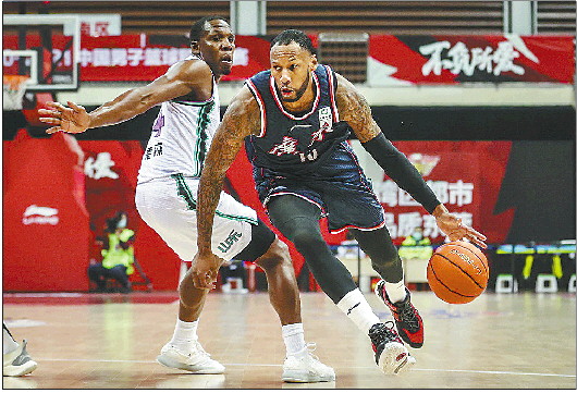 哈德森(左)在与广东队外援的较量中处于下风。 新华社发
