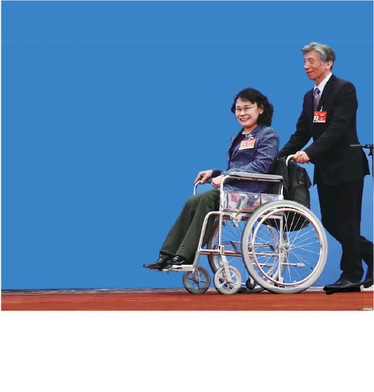 政协首场“委员通道”采访结束后,政协委员范迪安推着政协委员张海迪离开会场。 新华社发
