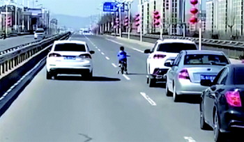 近日,莒县一名男童骑着儿童自行车上了沭河大桥,当时,桥上车辆来往密集,然而,在大桥的中间,司机们却纷纷降低车速、跟随在后保护男童过桥。
