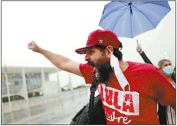 8日,卢拉的支持者在巴西首都巴西利亚的政府大楼前声援卢拉。 新华社发