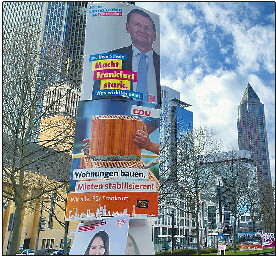 当地时间13日,德国法兰克福市中心的选举广告。(中新网)