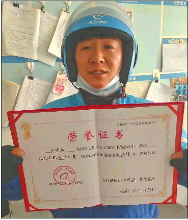 外卖小哥孙洪磊收到获奖证书后,格外开心。