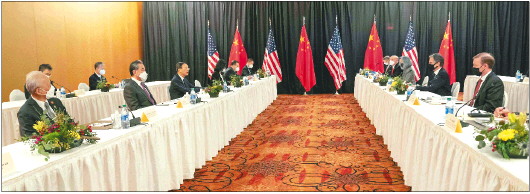 3月18日,中共中央政治局委员、中央外事工作委员会办公室主任杨洁篪、国务委员兼外长王毅在安克雷奇同美国国务卿布林肯、总统国家安全事务助理沙利文举行中美高层战略对话。 新华社发