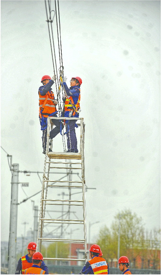 马芮琳克服刚开始的恐高,在高约5米的接触网上检修作业。