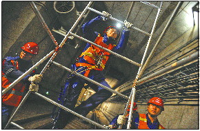1号线电客车停运后,在空荡荡的隧道内,马芮琳站在四五米高的梯车上,对接触网进行检修维护。