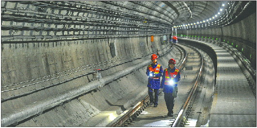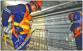 ◤马芮琳(右)和同事在隧道内进行步巡。