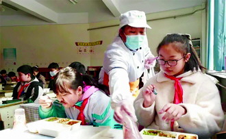 今春开学后,枣庄市立新小学积极推进“四项服务”,提升服务能力,满足家长需求,开学第一周就启动午餐配送工作。图为3月8日,学生们吃上了可口的午餐。
