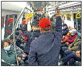 在济南地铁2号线向西通往王府庄的站台,记者看到,候车区基本被乘客占满。相比3月26日运营首日早高峰,29日周一早高峰2号线车厢内人数未见减少,反而有所增加,每节车厢均座无虚席,还有大量乘客站着。