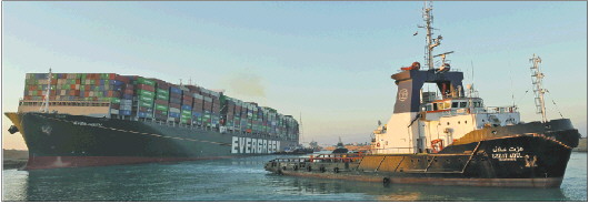2019年4月19日,一艘法国达飞集团旗下的10万吨集装箱船同样因故障在苏伊士运河发生搁浅,4艘拖船用了整整一晚才把事故船只拖走。