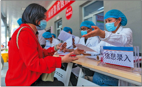 ◥近日,在瑞丽市景成医院新冠疫苗接种点,一名女士在填写信息。