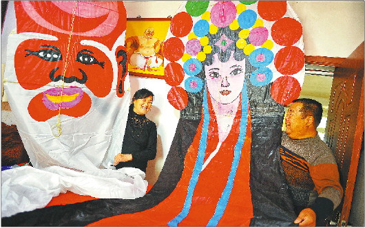 老两口整理最近制作的风筝,准备带到潍坊参加比赛。
