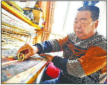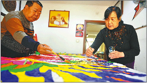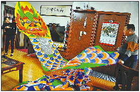 4月7日,在济南紫金山小区庞曰龙家中,老两口一边给一只巨型的风筝上色,一边讨论着。这只造型为凤凰的风筝长约20米、宽约5米,他们准备做好了拿到潍坊国际风筝节上去放飞。