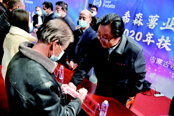 希森集团董事长梁希森在内蒙古为农户发现金。