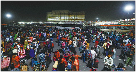 4月19日,人们来到印度首都新德里汽车站准备赶在“封城”前乘车返乡。 新华/路透