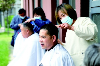 25日,济宁太白湖新区许庄街道高校生活园社区联合市第一人民医院、杨梅红美术学校、美吉姆早教中心、王华美发化妆学校、九龙家电、爱尔眼科医院、济州口腔医院等多家单位开展“弘扬劳模精神,共建红色社区”迎五一公益活动,让辖区群众在家门口就能享受各类便民惠民服务。图为志愿者为社区居民义务理发。