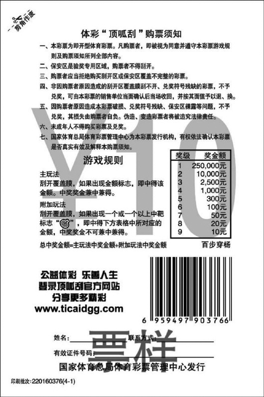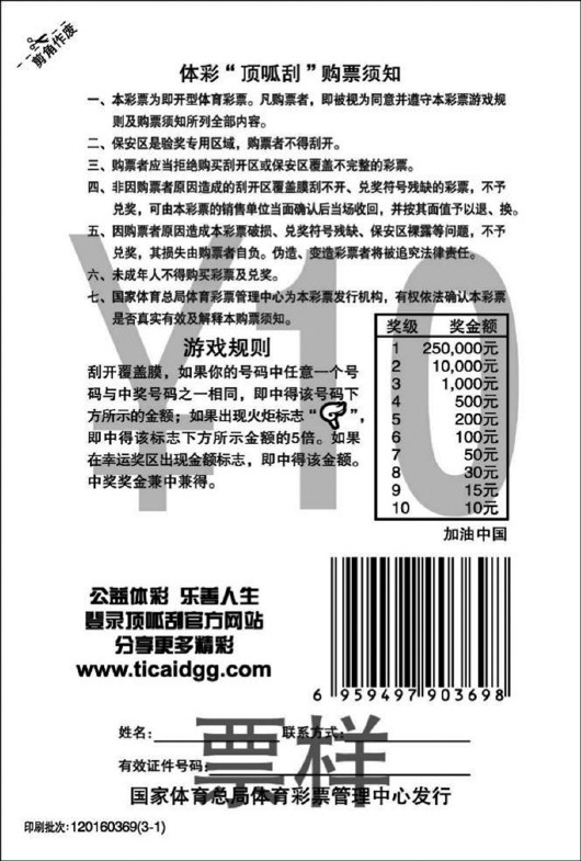 本次停止销售的即开型体育彩票印刷批次号前五位为“12016”或“22016”。印刷批次号见票背左下角,位置如图所示: