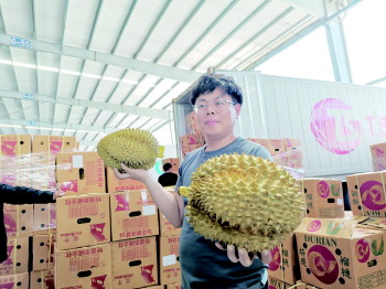 本报5月13日讯(记者 宋祖锋) 进入5月,进口榴莲迎来销售高峰,每天有240多万斤榴莲从青岛流入周边区域甚至全国各地市场,今年榴莲丰产,价格比往年下降一成左右。