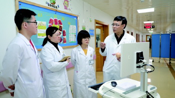 包洪初(右)与团队讨论患者病情。