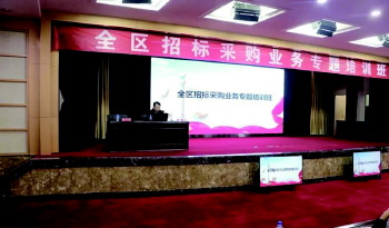 ▲图为派驻第一纪检监察组在全区招标采购业务专题培训班上进行廉政授课。