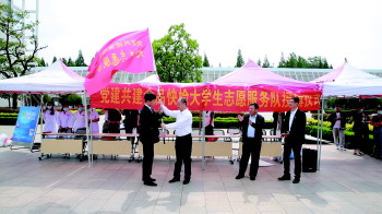 26日上午9点,在日照职业技术学院校园内,日照市市场监督管理局首先为党建共建食品快检大学生志愿服务队授旗。授旗结束后,来自日照市皮防所的工作人员又开展了免费的皮肤义诊活动。