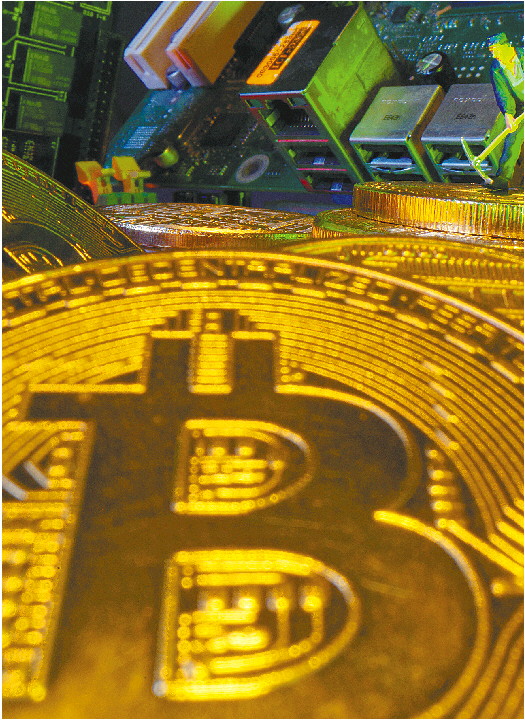 ◤摆在电脑主板上的比特币模型。 新华/路透