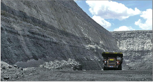 卡车在内蒙古鄂尔多斯市准格尔旗黑岱沟露天煤矿内作业。