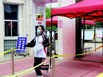 在德州一中考点,语文考试结束后,一名女生第一个走出考场。