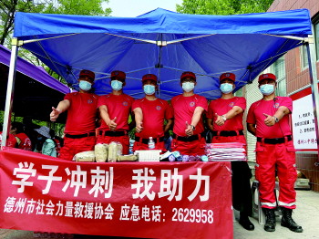 在德州二中考点,身着红衣、手拿对讲的一群志愿者引人关注。“我们是德州社会力量救援协会,隶属于市应急管理局,协会于去年10月组建,今年4月份正式成立,队员分为正式队员、预备队员和志愿者,目前有会员500余人。”队员王立钢告诉记者,“今年是我们首次参加护航高考的工作,全员出动,每个考点外,协会安排至少6人为考生提供服务,还准备了应急救援包、藿香正气水、雨伞、文具、救援车辆等,随时为考生提供服务。”