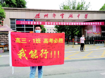在德州市实验中学考点外,高三教师程龙拿出全班53人的签名为学生加油打气,旗帜上写着自己的祝福“高三1班,高考必胜,我能行”。“我们班所有考生都在实验中学考点,正好我负责在此带队并帮助维持纪律。”程龙向记者们展示签名班旗,祝同学们旗开得胜。