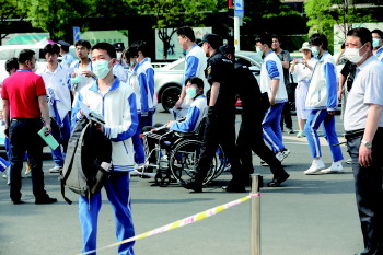 6月7日上午8点17分,一名坐着轮椅前来参考的考生在家长陪同下来到威海一中考点,执勤民警连忙上前,协助考生稳稳地进入考场。