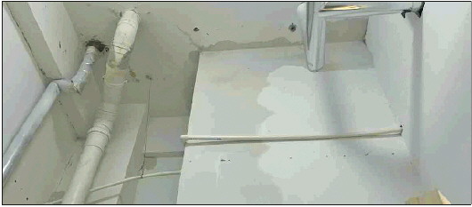 据刘先生介绍,他是在2020年1月份租了这里的商铺开了这家眼镜店。“租下这家商铺后,我的生意一直不错。但到7月份的时候,我们就发现厕所的地面上经常有积水,当时我们也没多想,就经常清理。”刘先生说,之后有一次有客人上厕所,有水滴到了客人的头上,当时还因此发生了纠纷。“这时我们才意识到,厕所产生的积水都是从楼上滴下来的。之后又过了一段时间,我们发现工作室的房顶也有滴水的情况。”随后记者来到刘先生店铺里的工作室,抬头可以看到天花板上的墙皮被水泡得已经有破损出现了。“第一次发现漏水后,我们就赶紧找楼上处理这件事。”