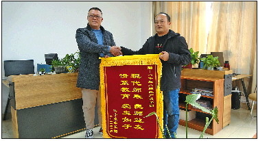 代子豪同学的家长来到学校,给班主任朱广波送来锦旗和感谢信。
