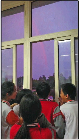 据梁正回忆,同学们在看到彩虹和晚霞后都惊叫起来,非常兴奋,有很多同学说这是自己人生中第一次看到彩虹,还是和全班同学一起欣赏的。梁正说:“我觉得自己一个人看的感觉可能差了点,但是全班同学一起看,那种氛围也是非常难得,我觉得他们快乐,我也觉得很欣慰。”