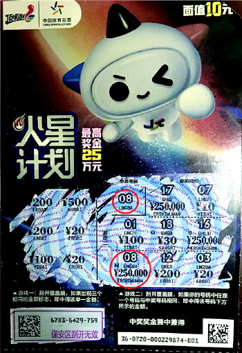 来到店里,他先是刮了有100多块钱的散票,然后注意到了这款新票“火星计划”,“这票做得真漂亮,关键是很应景,当时看新闻特别自豪。刚上市时我就刮了几本,听说卖的很快,市面上几乎见不到了,没想到这家店还有存货,我就刮开1包,掐头去尾,这是第三张,就中了大奖!”