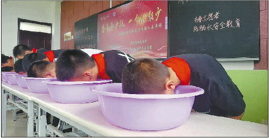 安全课堂上,10名同学站在10个脸盆前,大家按照要求将脸面、鼻子、嘴巴浸入水中,体验在水中的真实感受。