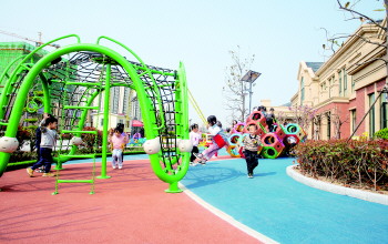 即墨区皋虞路幼儿园孩子进行室外活动。
