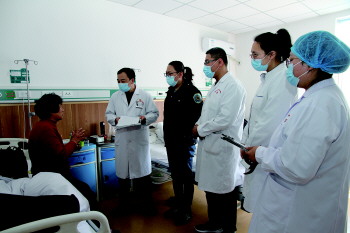 耳鼻喉头颈外科副主任江安世一边操作一边讲解,就小儿鼻炎、外伤后听力下降等知识点向基层医生们进行了交流探讨。皮肤科医生徐光辉就一例皮肤疾病病例进行了现场教学,为基层医生们讲解了治疗规范。肿瘤二科护士长迟延伟现场向村民们分发肿瘤知识科普宣传册,就目前科室开展的工作向基层医生做了探讨交流,并到治疗室、输液间进行工作指导。
