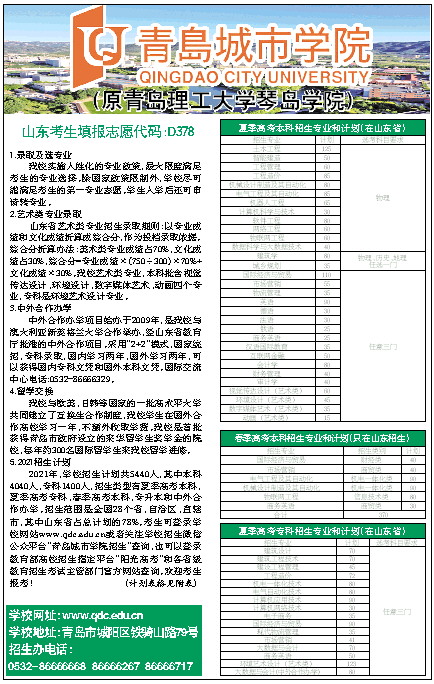 2021年,学校招生计划共5440人,其中本科4040人、专科1400人,招生类型有夏季高考本科、夏季高考专科、春季高考本科、专升本和中外合作办学。招生范围是全国28个省、自治区、直辖市,其中山东省占总计划的78%。考生可登录学校网站www.qdc.edu.cn或者关注学校招生微信公众平台“青岛城市学院招生”查询,也可以登录教育部高校招生指定平台“阳光高考”和各省级教育招生考试主管部门官方网站查询。欢迎考生报考! (计划表格见附表)
