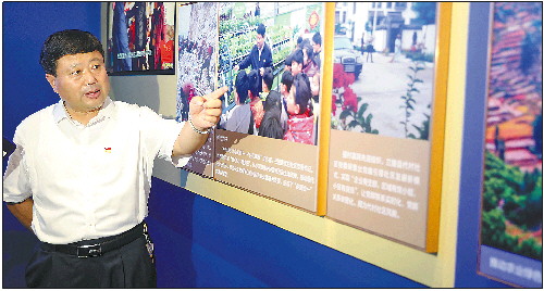 主题展上,临沂市兰陵县卞庄街道代村党委书记王传喜向大家介绍图片上的故事。