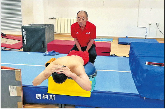 走进省体育训练中心的体操训练馆,不同年龄段的队员正在热火朝天地训练,动作带来的强大冲击力碰撞在器械上发出振聋发聩的声音。教练们在场边盯着队员做动作,并不时针对队员暴露的问题进行简短的指导。此时,场地的一角,山东省体操男队总教练曲建春正在进行颈椎牵引治疗,但他的目光始终追随着队员,聚精会神地盯着训练场上的一切。